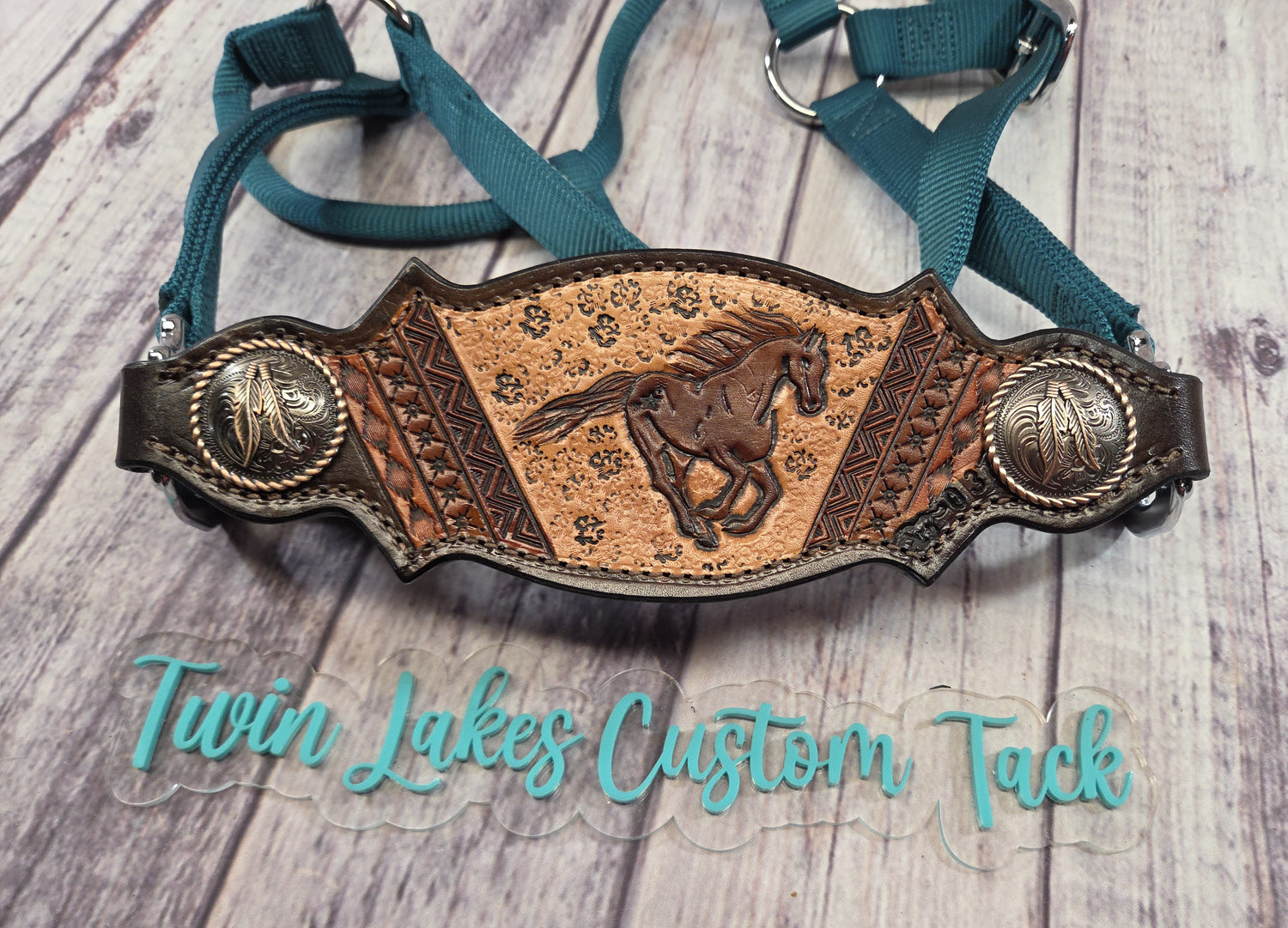Vegas shape, chocolate leather, sorrel running mustang on an average size turquoise standard Weaver halter