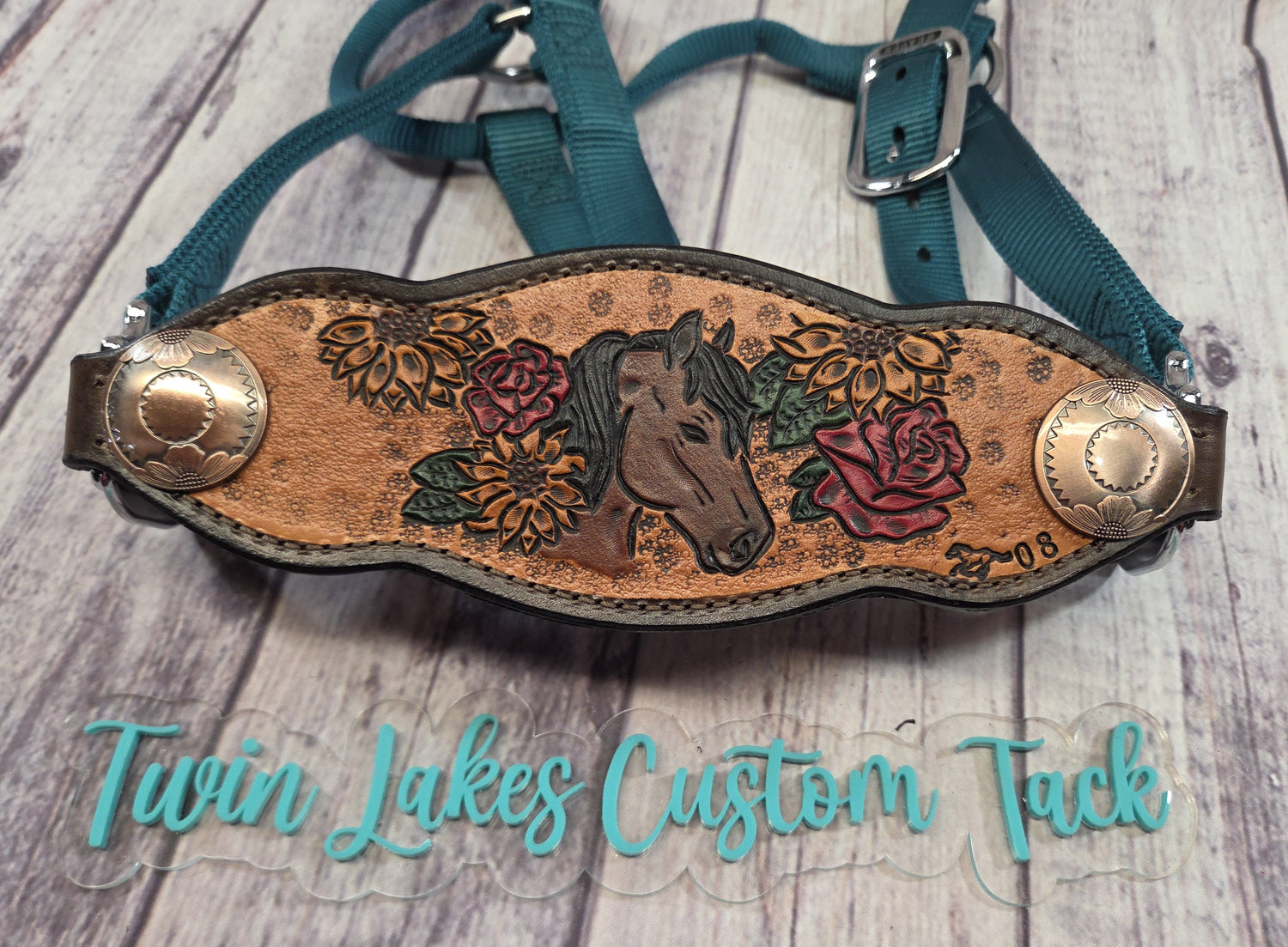 Scallop shape, bay horse with sunflowers and roses on an average size turquoise halter